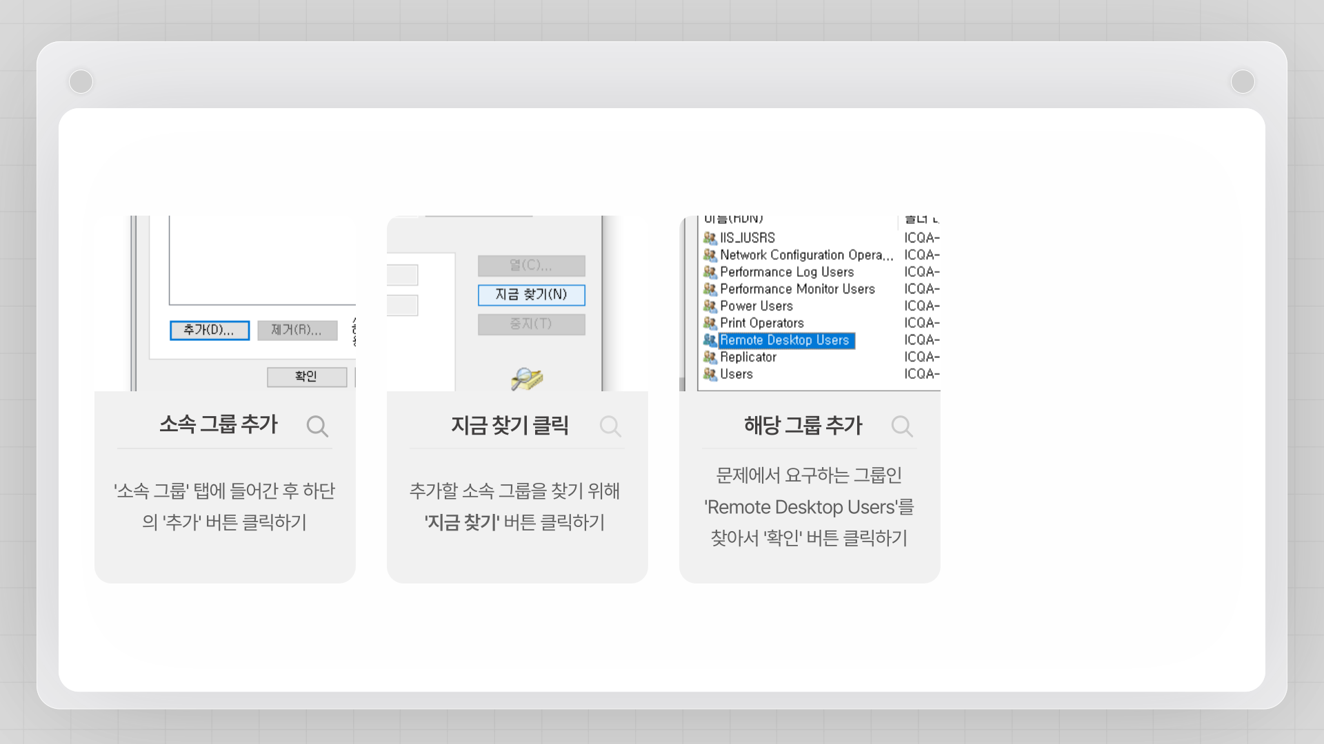 - '추가' 버튼을 클릭하고 'Remote Desktop Users' 그룹을 찾아 추가합니다. (또는 '고급' -> '지금 찾기'를 통해 검색)