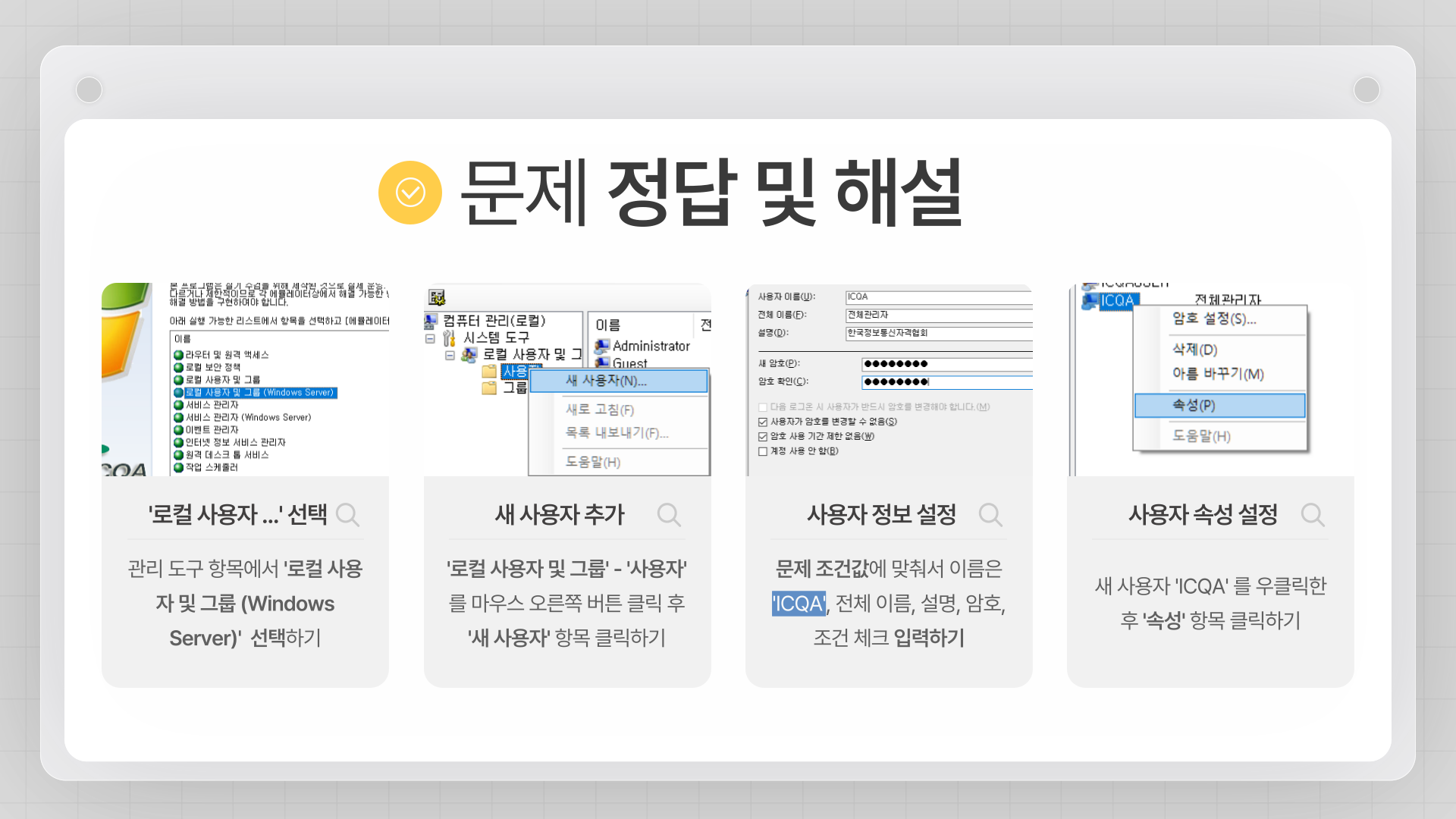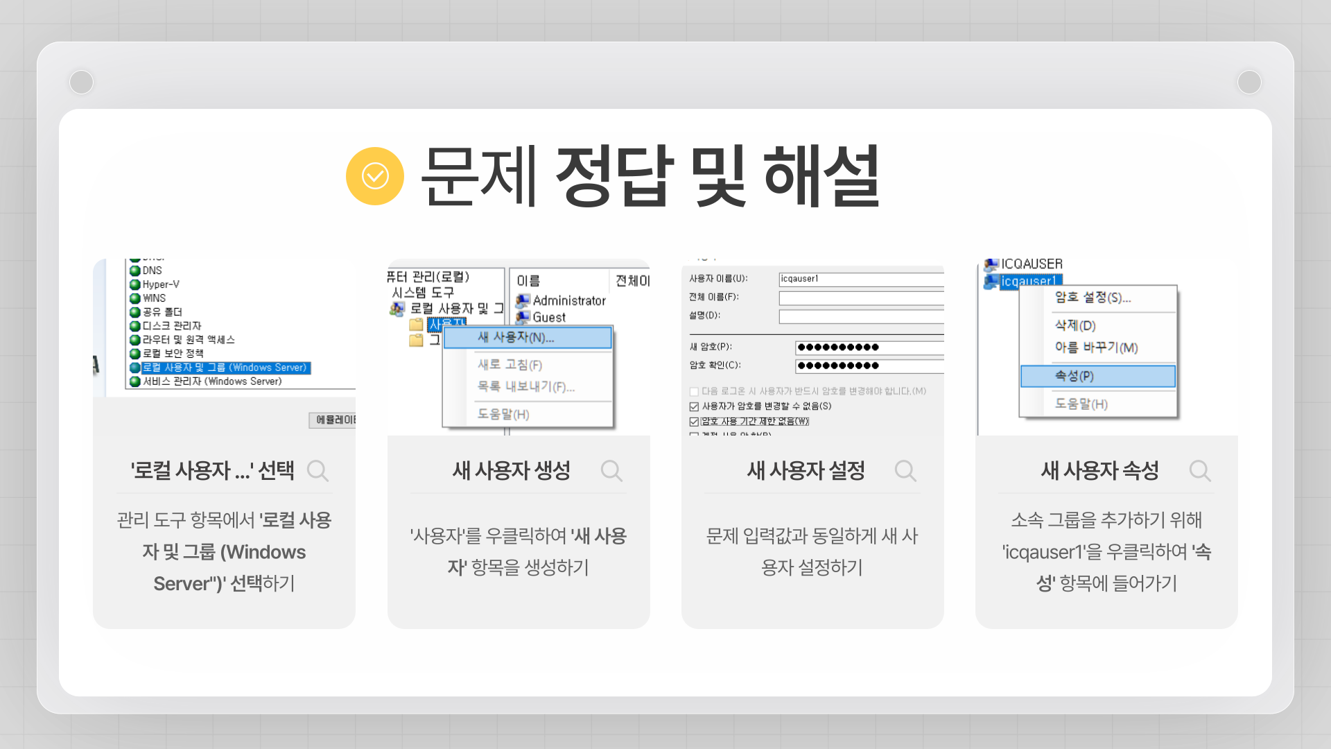 - 새로 생성된 사용자 'icqauser1'를 우클릭하고 '속성'을 선택합니다.