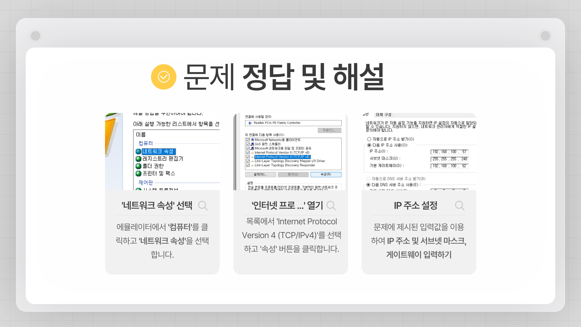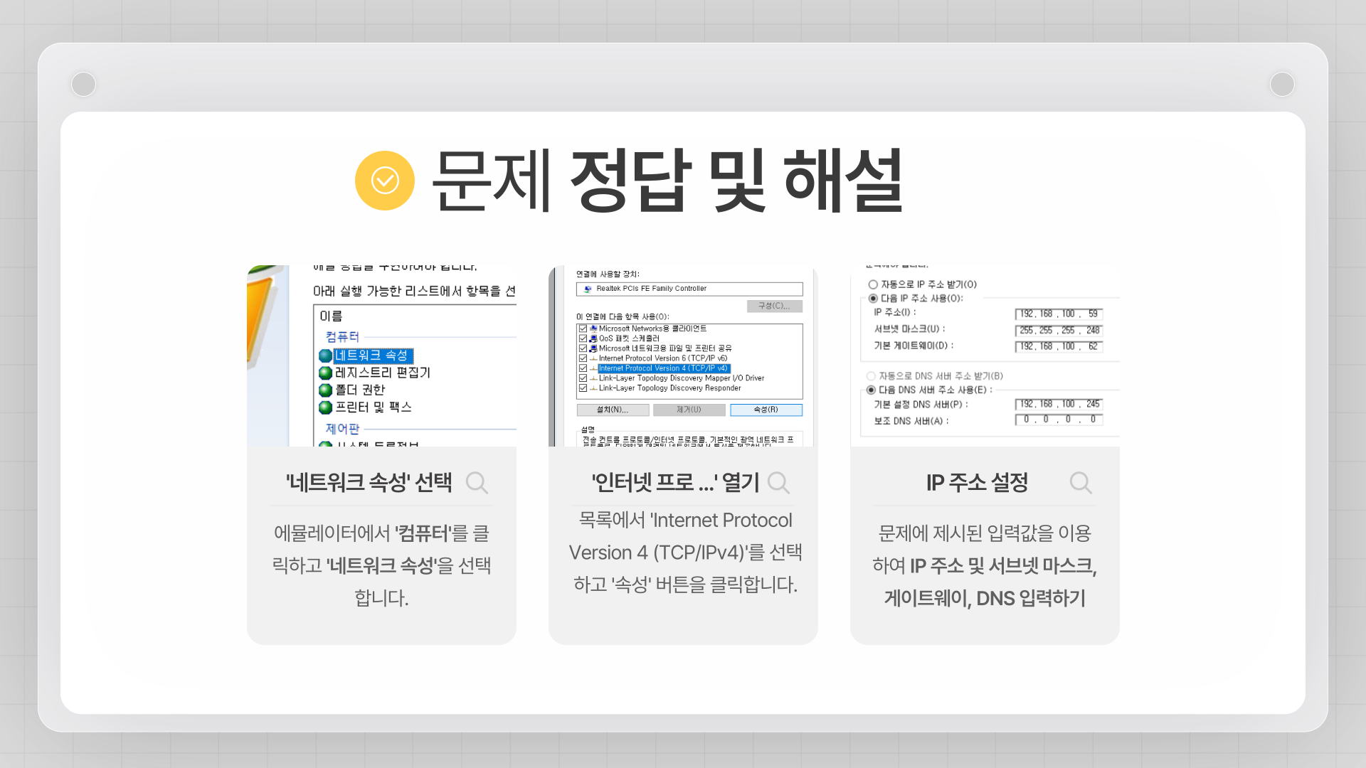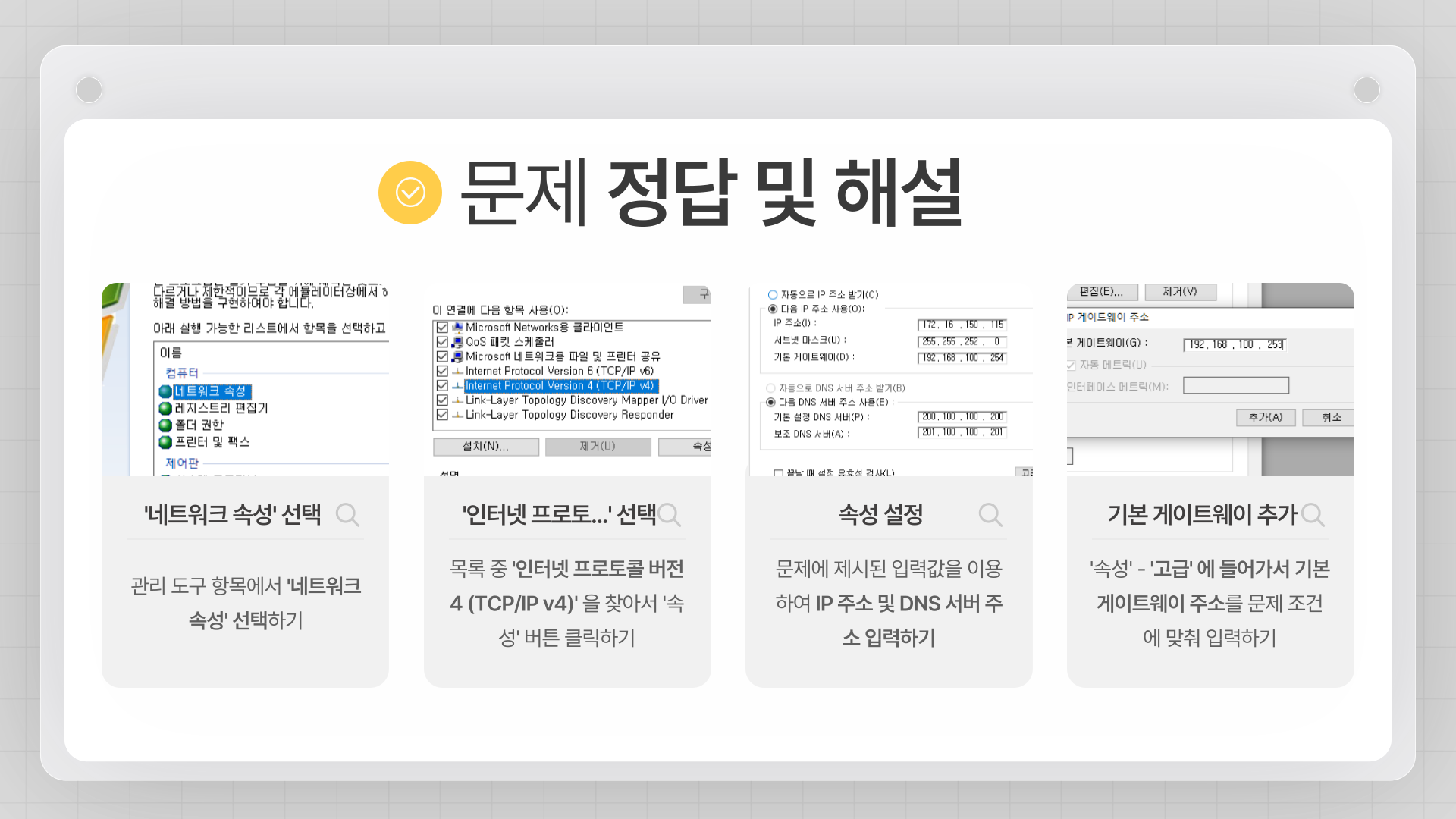 네트워크 환경에 제시된 IP 주소와 서브넷 마스크를 추가하고, 기본 게이트웨이 및 DNS 서버를 설정하시오.