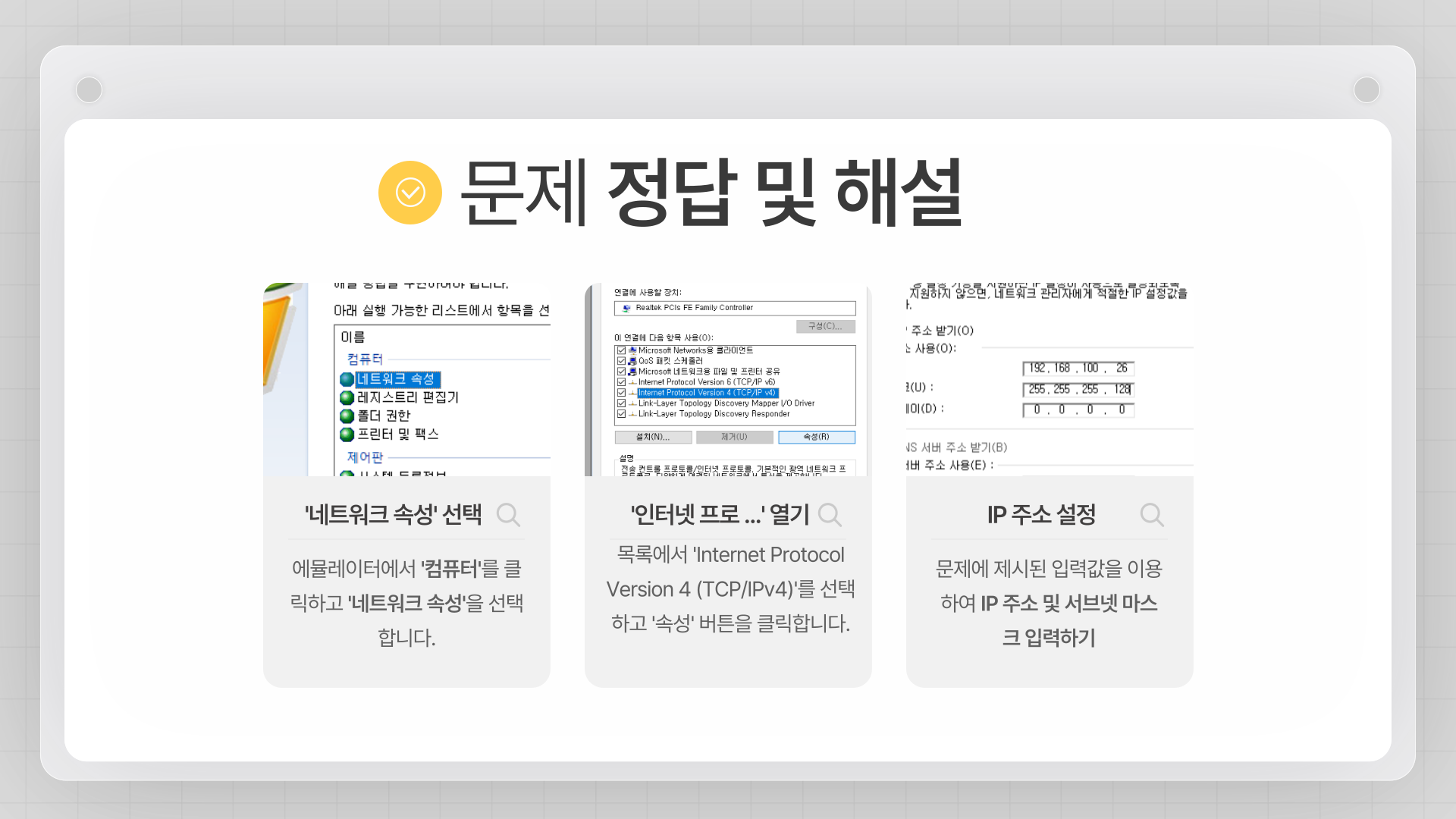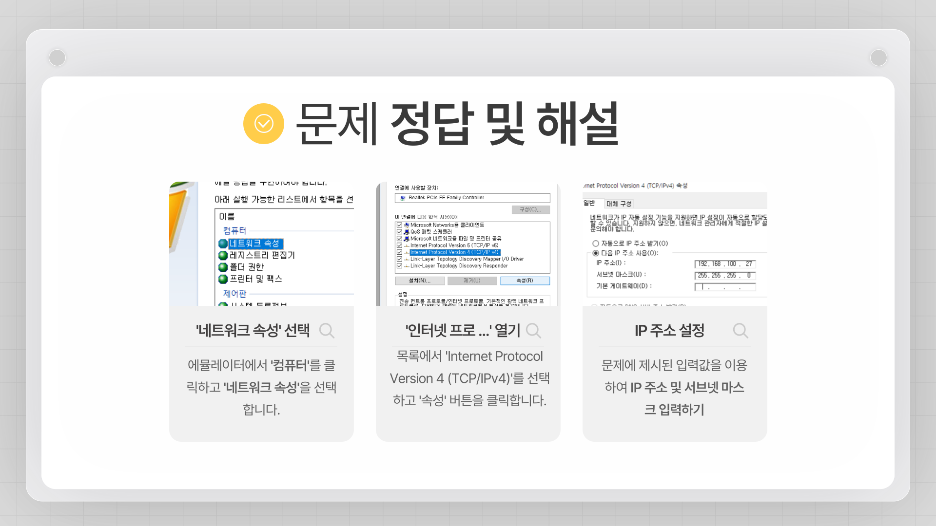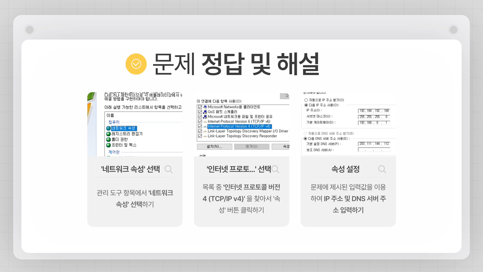 - IPv4 속성 설정: '인터넷 프로토콜 버전 4 (TCP/IPv4)' → '속성'