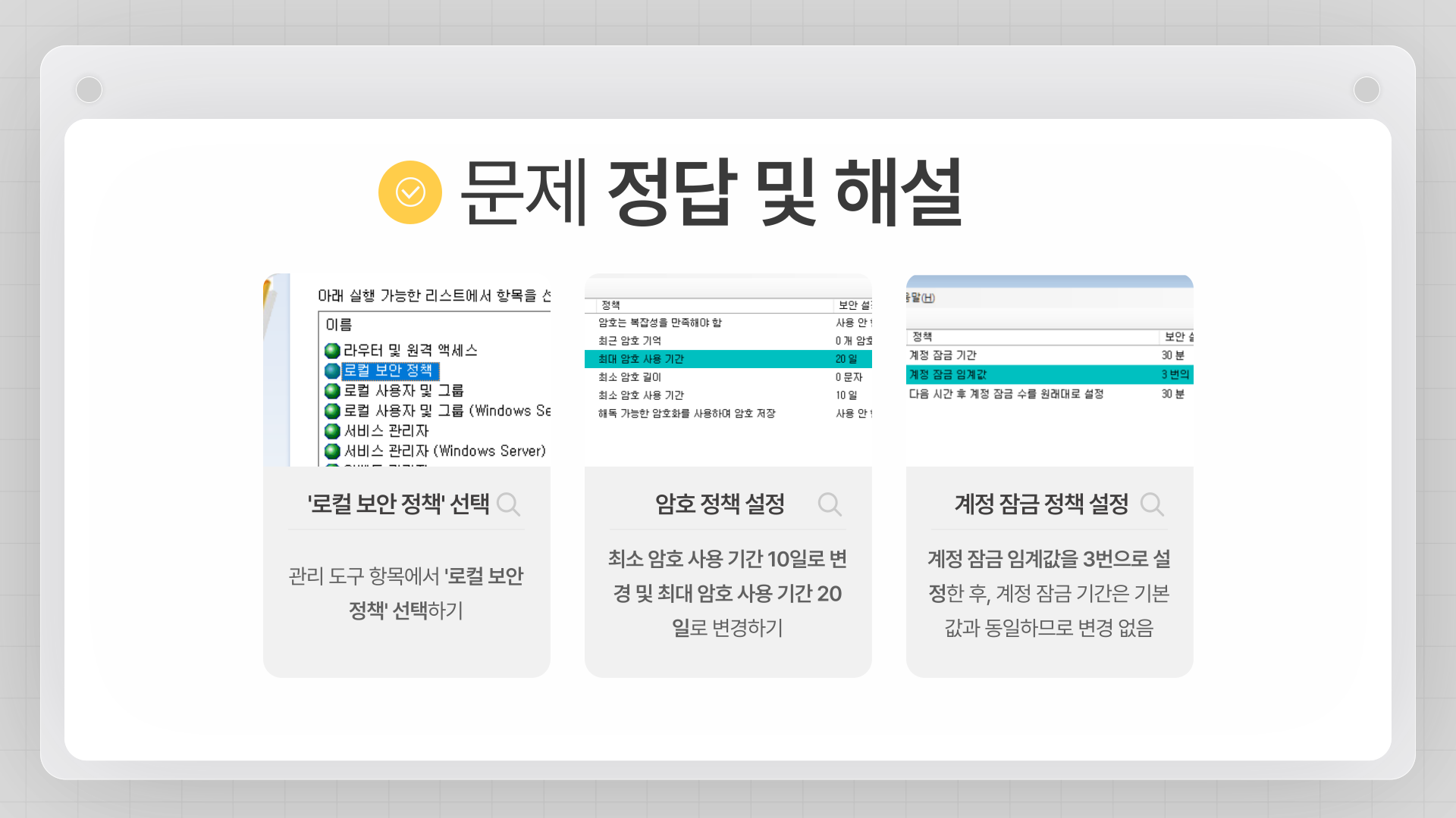 - 계정 잠금 임계값: 3번 로그인 실패 시 30분간 계정 잠금