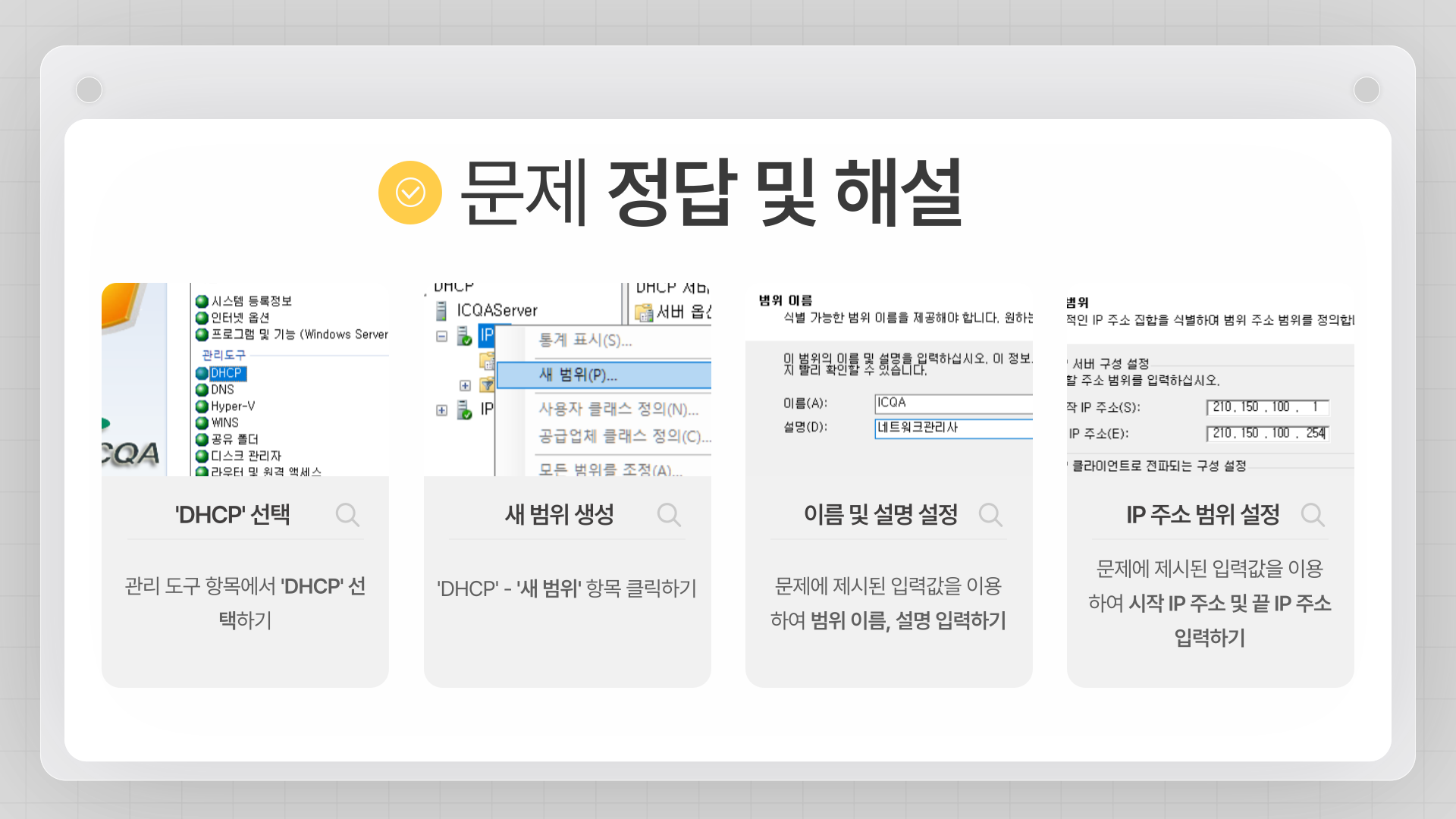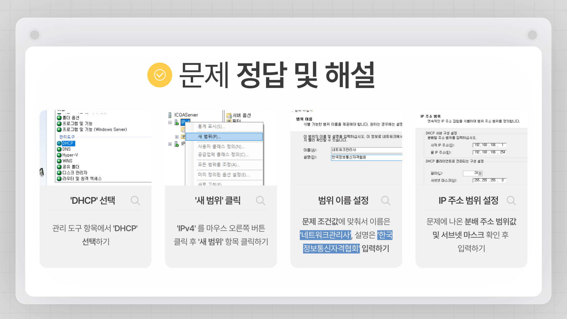 - 매회 꾸준히 중요 문제들이 출제되며, Active Directory, DHCP, DNS, 웹 서버(IIS) 등 다양한 윈도우 서버 기능 설정 능력을 요구합니다.