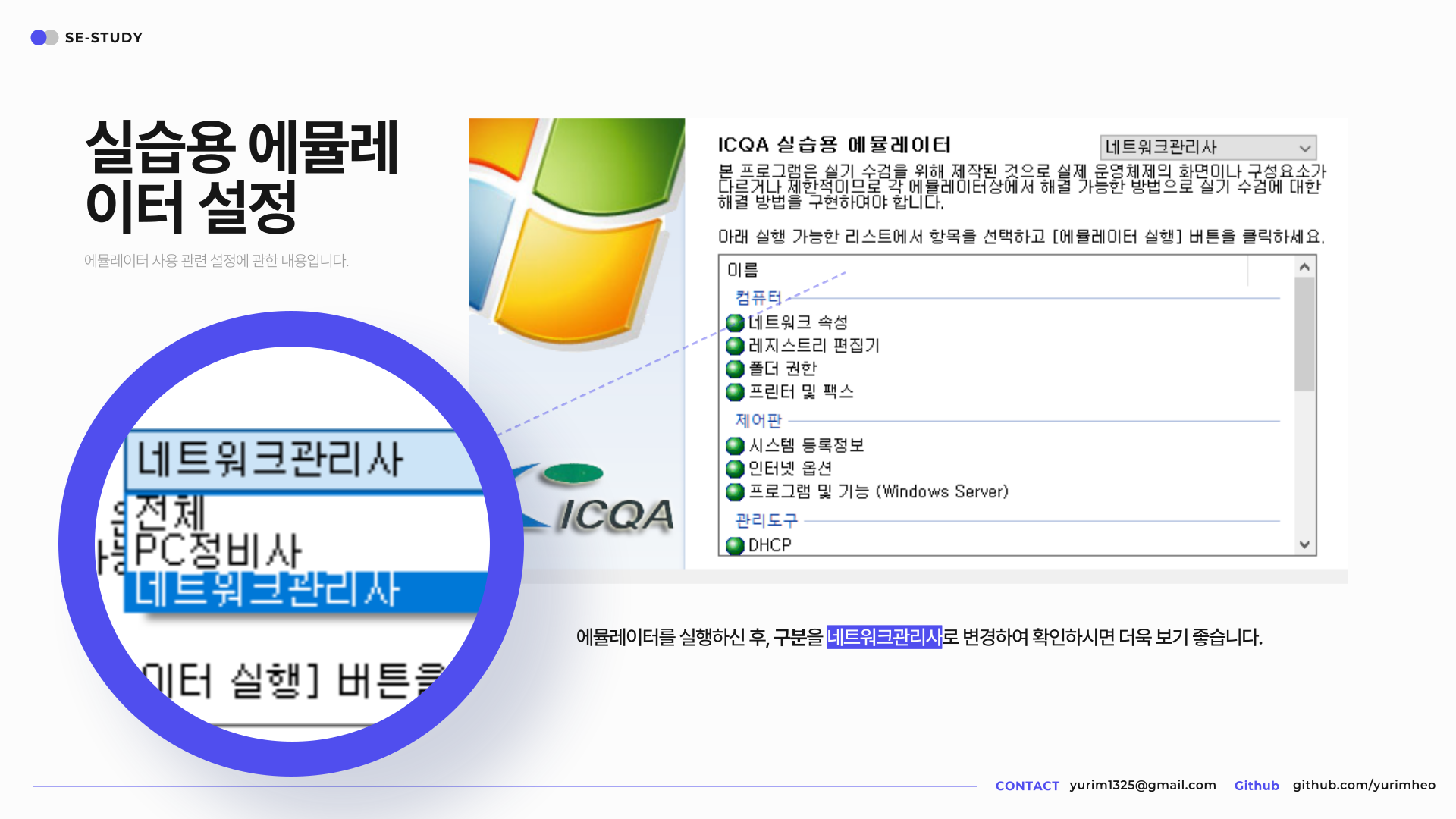 사진과 같이 에뮬레이터를 실행하신 후, 구분을 네트워크관리사로 변경하여 확인하시면 더욱 보기 좋습니다.