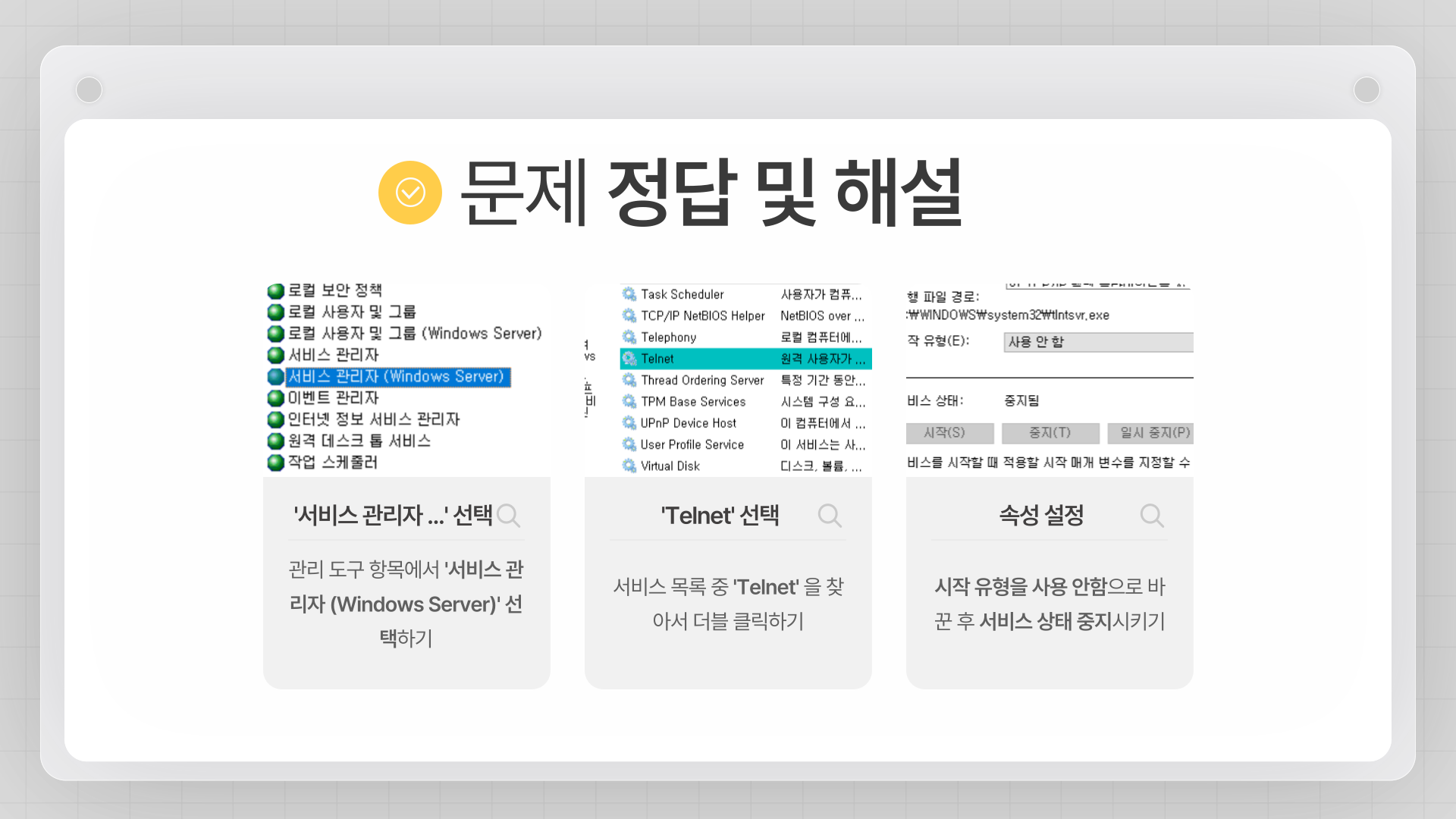 - Telnet 서비스 중지 및 시작 유형 설정: