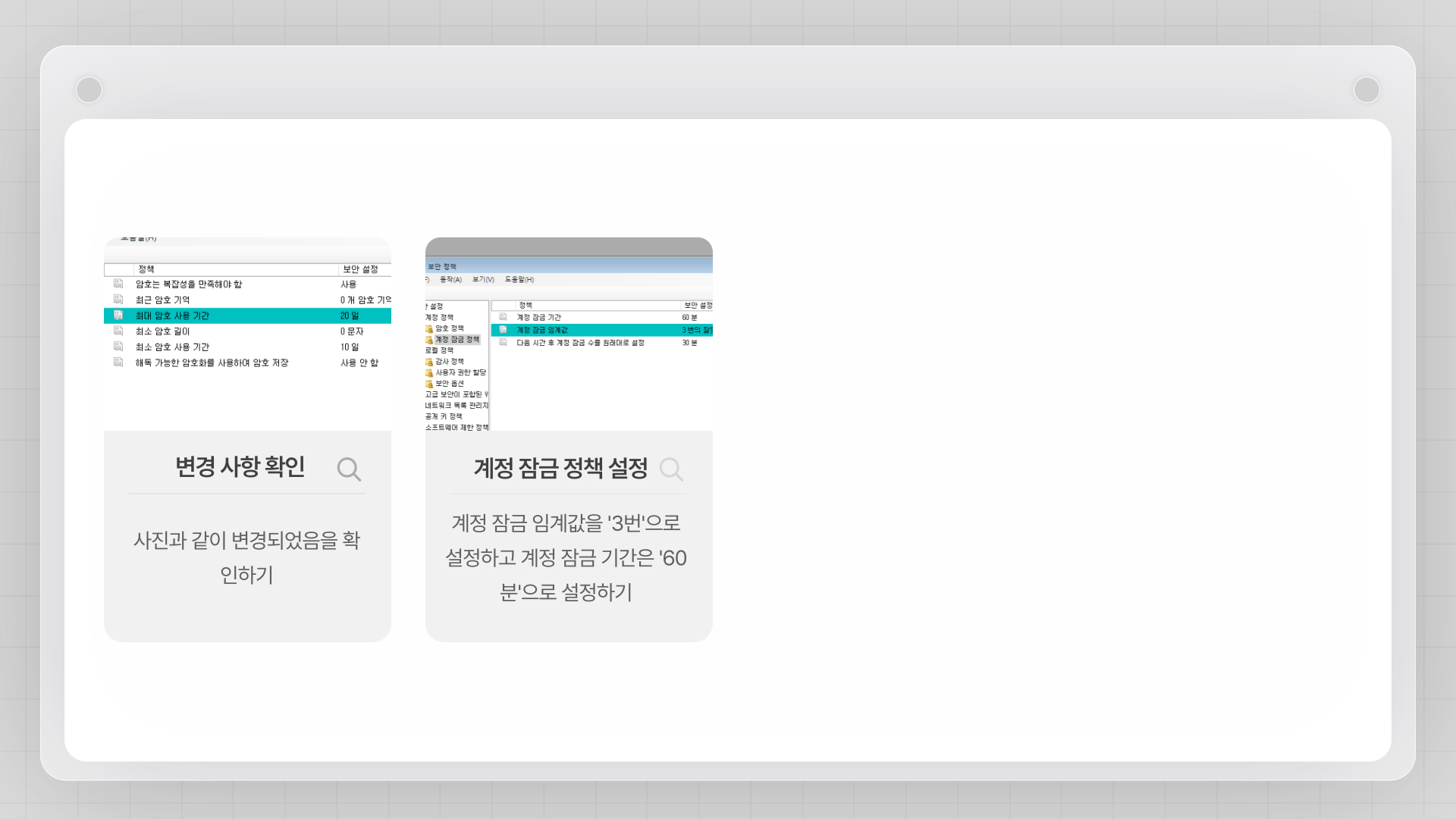 - 적용 및 확인: 각 정책을 더블 클릭하여 속성 창을 열고, 요구 사항에 맞게 값을 설정한 후 '확인'을 클릭하여 적용합니다.