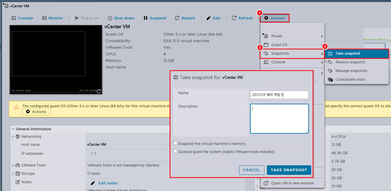 - vCenter VM 우클릭 > 스냅샷 > 스냅샷 찍기 > 식별 가능한 이름을 지정하고 생성합니다.